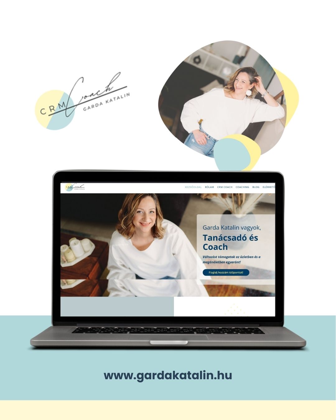Katának volt már honlapja, amit saját maga készített, és az acélkék szín árnyalatai domináltak benne. Emellé hoztuk be a sárgát, hogy az egyhangúságot megtörje, és élettel telibbé tegye az összképet, valamint kifejezze Kata lendületét, lelkesedését.