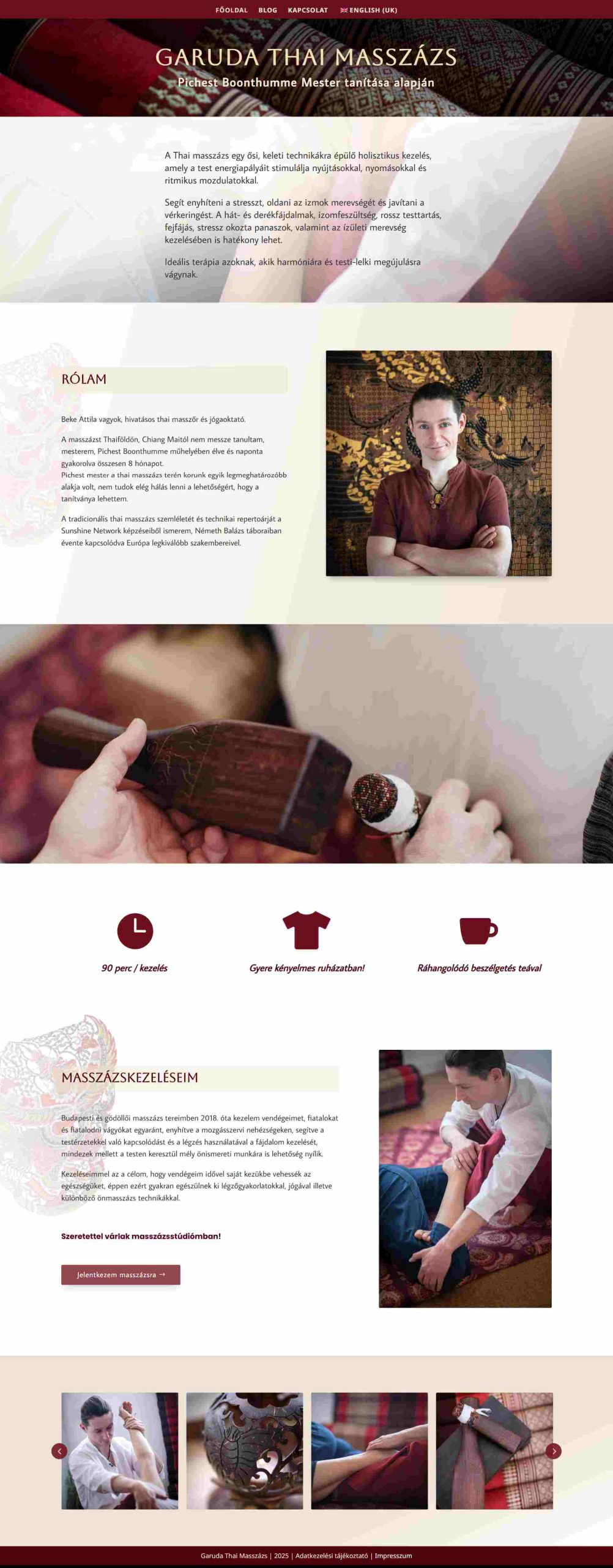 A meleg színek, a textilek, gyertyák, teáscsésze, fából és természetes anyagokból készült tárgyak fotói belsőséges, barátságos légkört igyekeznek teremteni itt az online térben is, csakúgy, mint Attila masszázsstúdióiban. Az egyszerű, modern és elegáns betűtípusok alkalmazása is hozzájárul az összhatáshoz.