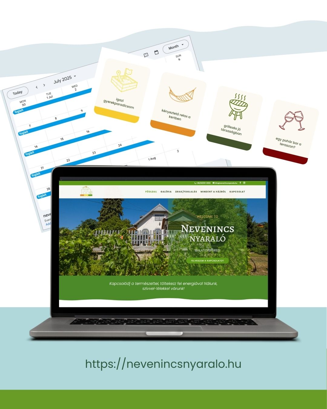 A Nevenincs Nyaraló weboldala kicsit kilóg a portfóliónk többi eleme közül, viszont mindenképp szerettük volna szerepeltetni a többi, szívünkhöz közel álló projektünk sorában.